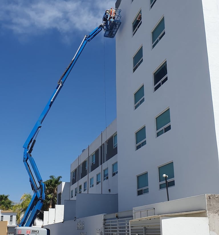 También realizamos trabajos en altura con personal capacitado y equipo de seguridad. Nos encargamos de proteger superficies, corregir imperfecciones y entregar un resultado limpio y profesional, sin afectar la operación diaria del inmueble.